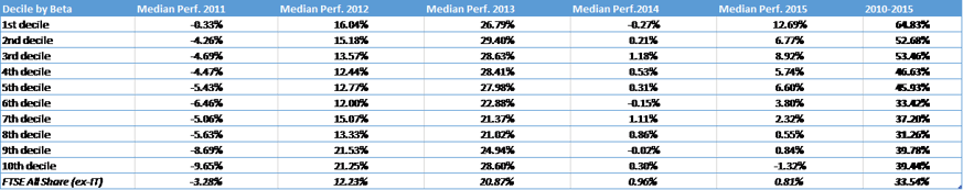 When you look at the performance of the underlying funds and break down the IA UK All Companies sector every year by decile, ranked by beta – what you see is a clear indication that over the past five years an investor putting money into the lowest-beta funds in the sector, would have significantly outperformed both its peers and the benchmark, as is clearly highlighted by the table below showing calendar year performance of the different groups since 2011.